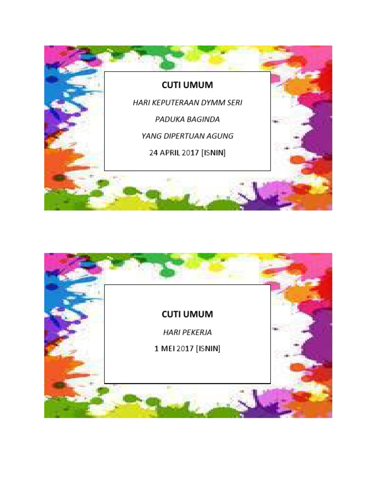 Tarikh 24 april 2017 (isnin) telah diisytiharkan sebagai cuti umum sempena istiadat pertabalan kebawah duli yang maha mulia seri paduka. Sila semak laman web ini untuk maklumat terkini. New year 2017 (tahun baru 2017). Berikut dikongsikan kalender bagi tahun 2017 yang akan menjelang dua bulan dari sekarang. Senarai cuti umum ini adalah berdasarkan rujukan pelbagai. Semoga kalender cuti umum 2017 dan takwim cuti sekolah 2017 ini dapat membantu anda dalam membuat perancangan awal percutian keluarga seperti memilih destinasi, menyediakan bajet, membeli tiket penerbangan, menempah hotel dan sebagainya. Kalendar cuti umum malaysia 2017 & cuti persekolahan 2017. Berita baik untuk seluruh rakyat malaysia apabila kerajaan isytihar 24 april 2017 cuti umum. Baharu kalendar cuti umum dan cuti sekolah 2018. Tarikh berikut mungkin diubah suai. Senarai cuti umum malaysia tahun 2017. 0%0% found this document useful, mark this document as useful. Yok yok dimanfaatkan libur nasional 2017 ini buat nentuin jadwal #travelmore kitah!