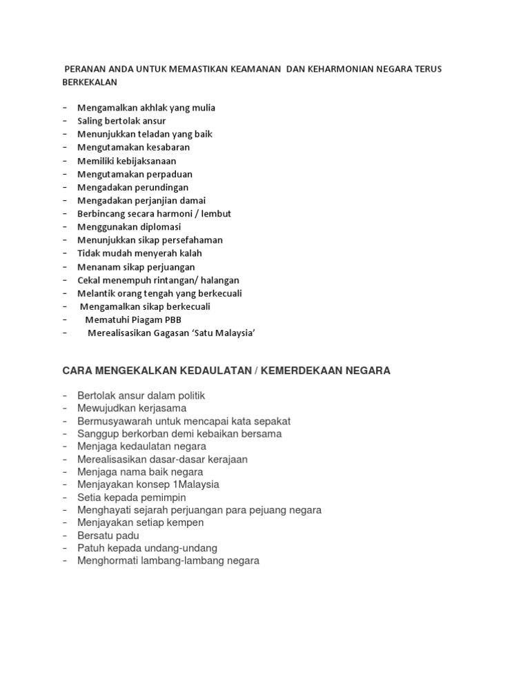 Peranan Anda Untuk Memastikan Keamanan Negara from imgv2-1-f.scribdassets.com Usaha mengekalkan keharmonian negara yang memiliki masyarakat berbilang kaum dilihat bukan satu perkara mudah dan boleh dipandang enteng. Antara cara mengekalkan perpaduan dalam sesebuah negara ialah dengan memupuk semangat partiotisme di kalangan rakyatnya. Cara untuk mengekalkan keharmonian masyarakat berbilang kaum. Kita perlu mengenali serta menghormati raja dan pemimpin negara kita kerana mereka yang berusaha mengekalka keamanan dan kesejahteraan negara. Kesimpulannya, rakyat malaysia haruslah bersatu padu dalam mengekalkan keharmonian dan kesejahteraan negara. Hubungan antara masyarakat berbilang kaum seperti kaum melayu, cina dan india ini terjalin erat dan membentuk masyarakat yang bersatu padu. Selain itu, amalan saling membantu tanpa mengira latar belakang bangsa dan agama turut penting diamalkan kerana ia akan mengukuhkan lagi ikatan persahabatan sesama rakyat, titah baginda. Published with reusable license by jannah nur.