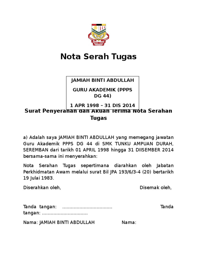 Related : Nota Serah Tugas 2019 : Nota serah tugas zamrud - Maybe you would like to learn more about one of these?.
